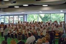 Der Schülerchor der Jahrgangsstufe 6 unter der Leitung von Sylvia Quell, am Klavier von Salomon Ebert begleitet, sang stimmgewaltig die Lieder „In der Bar zum dicken Hund“ und „Laurenzia“ und animierte die Eltern und Gäste zum Mitklatschen und Mitmachen.